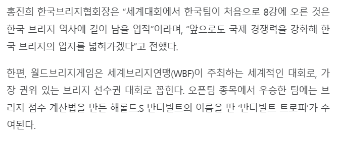 브리지게임 수업을 담당하시는 노승진교수님이 지난달 아르헨티나 부에노스아이레스에서 개최된 제16회 월드브리지게임에서 사상최초로, 아시아에서 유일하게 8강에 진출했습니다. 자랑스럽고 축하드립니다~~~!!!!!