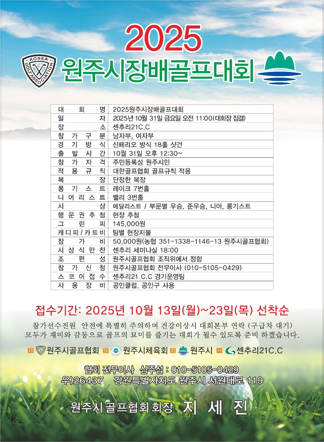 10월31일 센추리21cc에서 개최된 2025 원주시장배골프대회에 한라대학교 골프산업학과2학년 장성덕, 피정미, 박상범, 박준혁, 선광복 학우가 출전하였습니다.