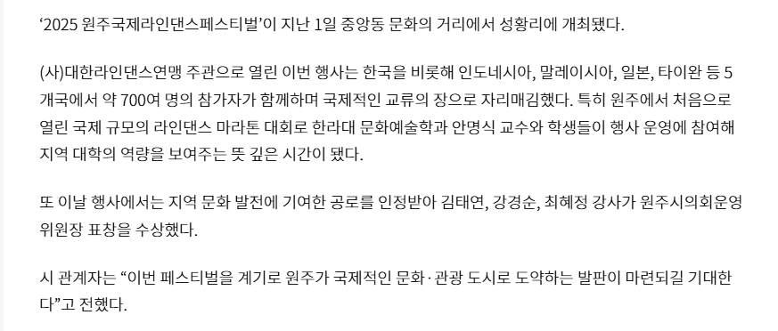 한라대 라인댄스팀, 국제 및 국내대회 1위 입상(강원일보)