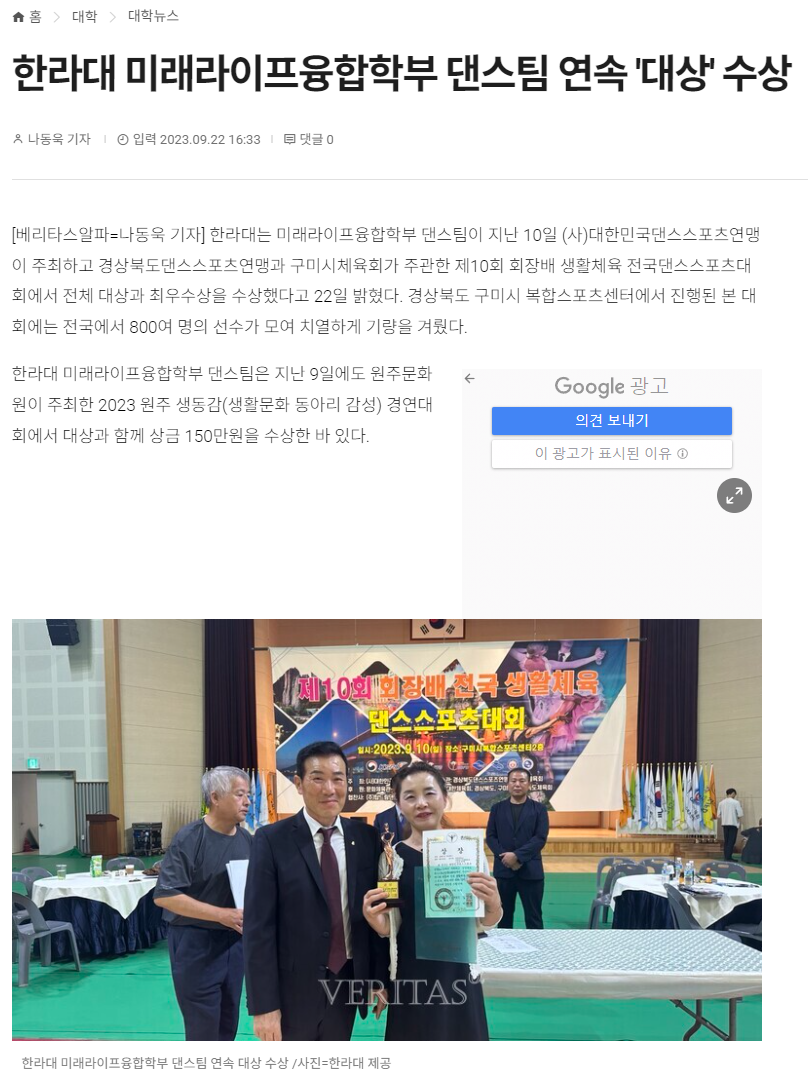 미래라이프 댄스팀 연속 대상 수상(베리타스 알파 보도)