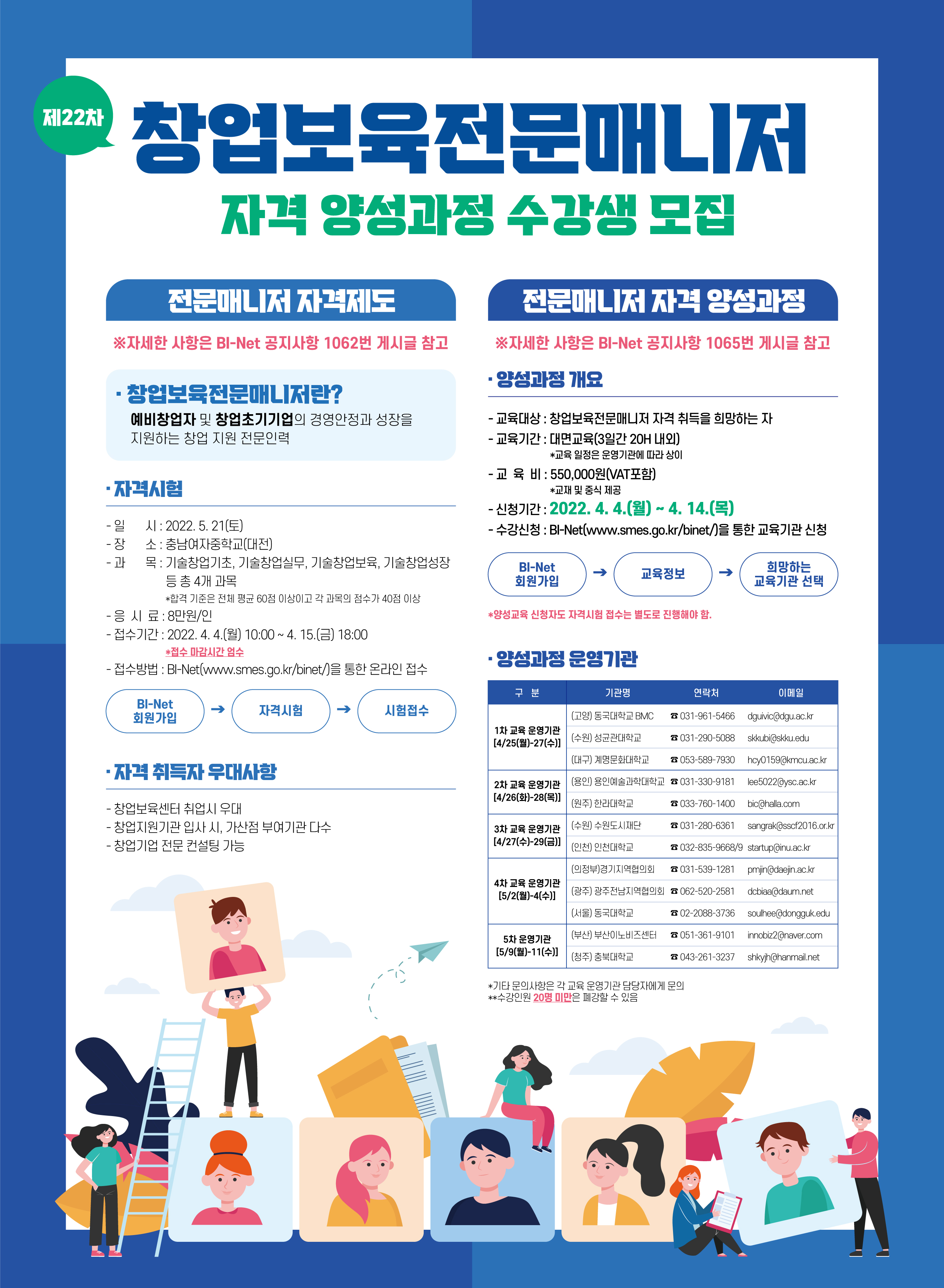 가. 교육 대상 : 창업보육전문매니저 자격 취득을 희망하는 자 나. 교육 기간 : 대면교육(3일간 20H 내외) 다. 교 육 비 : 550,000원(VAT포함) * 교재 및 중식 제공 라. 신청 기간 : 2022.4.4.(월) ~ 2021.4.14.(목) 마. 수강 신청 : BI-NET(www.smes.go.kr/binet/)통한 교육기관 신청 [BI-Net 회원가입] ☞ [희망하는 교육기관 선택] ☞ [양성과정 교육신청] * 양성교육 신청자도 자격시험 접수는 별도로 진행해야 함. 라. 문 의 처 : 한라대학교 창업보육센터 ☎033-760-1400 * 수강인원 20명 이하는 폐강할 수 있음