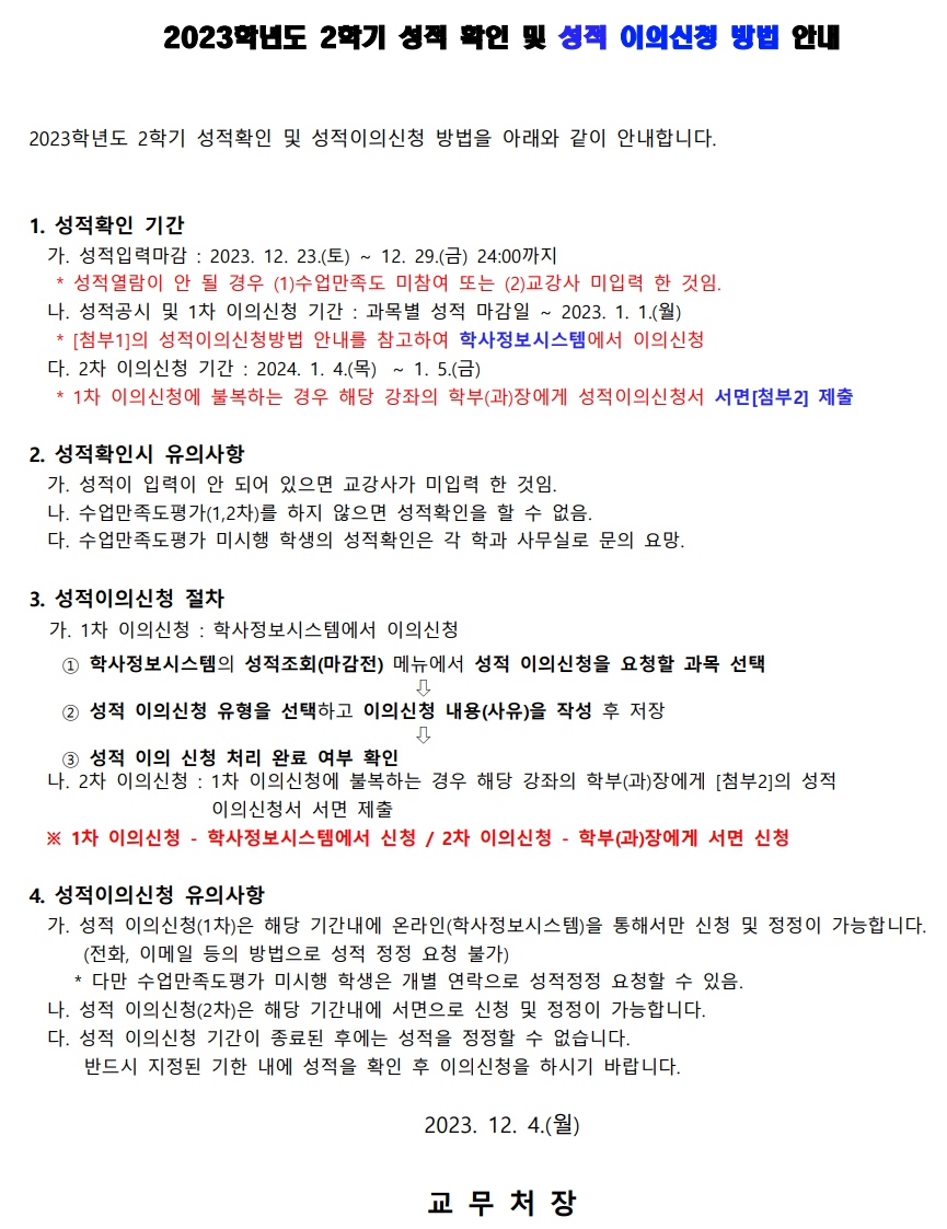 2023학년도 2학기 성적확인 및 이의신청 안내