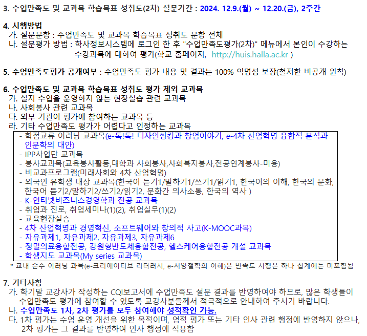 2024학년도 2학기 수업만족도 및 교과목 학습목표 성취도 평가(2차) 안내