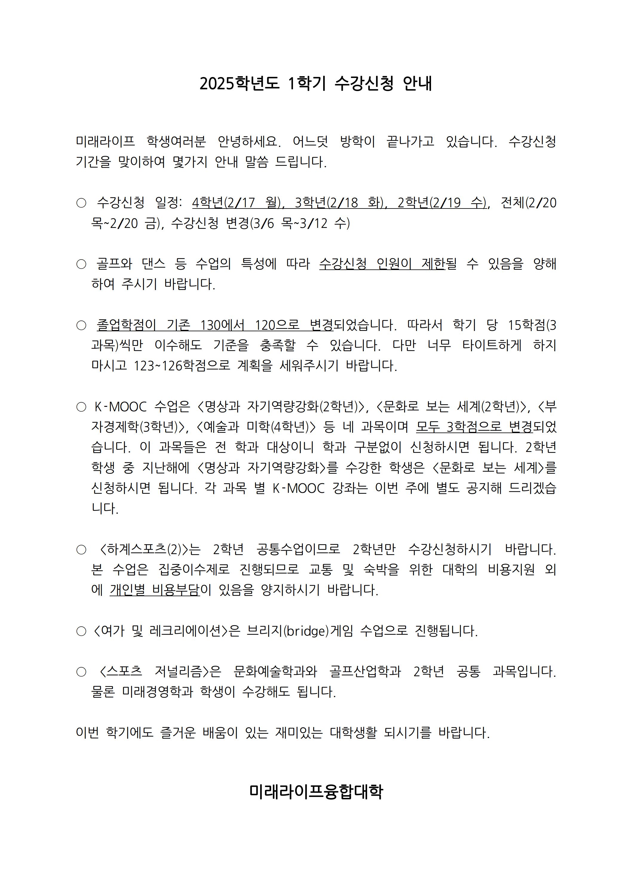 2025학년도 1학기 수강신청 안내(2~4 재학생)