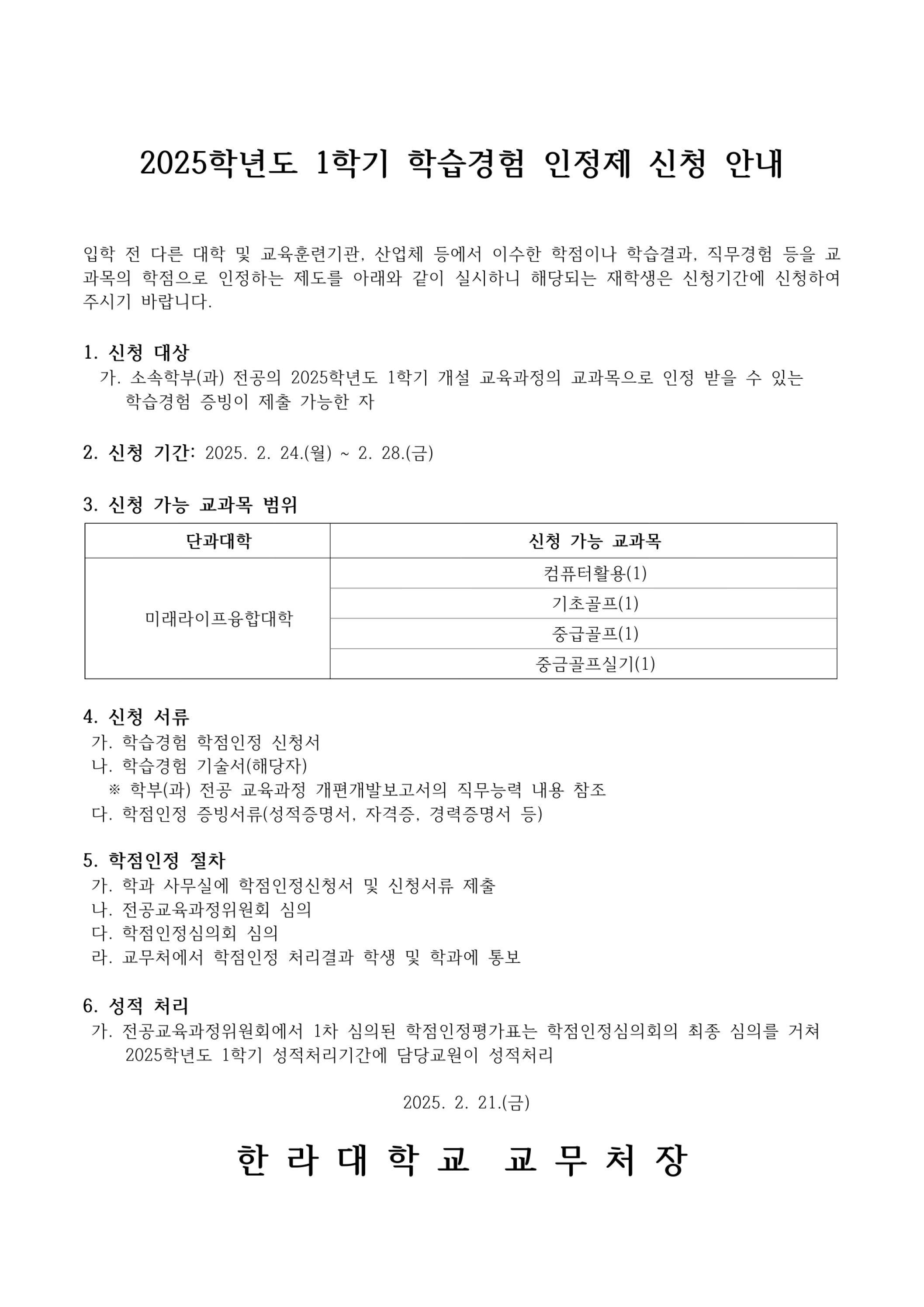 | 첨부파일 | [첨부1] 2025_1 학습경험 인정제 시행공고문.jpg [첨부3] 서식2_학습경험 기술서(학생작성).hwp [첨부2] 서식1_학습경험 학점인정 신청서(학생작성).hwp | ||