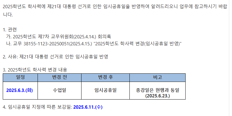 학사력 변경안내(6.3 대통령 선거일)
