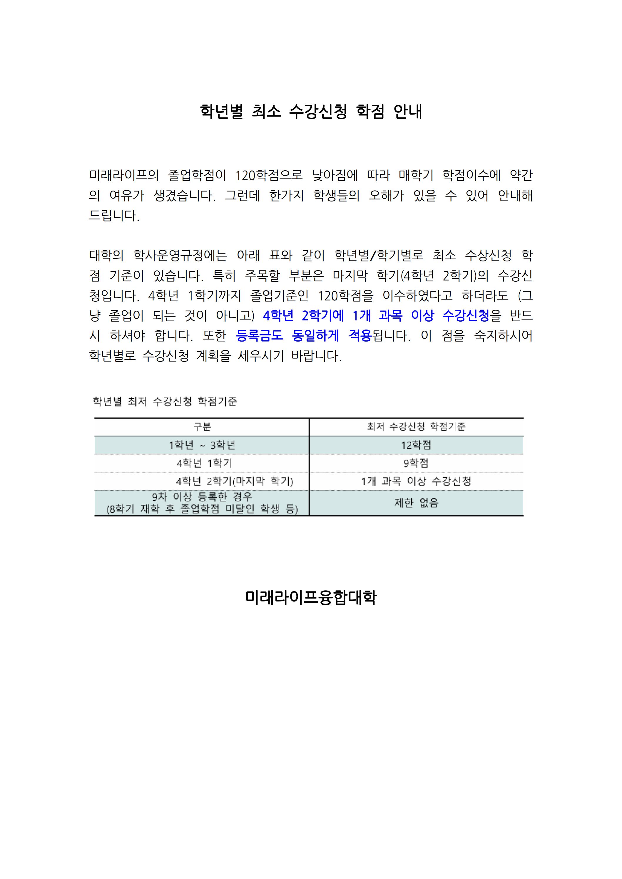 학년별 최소 수강신청 학점 안내