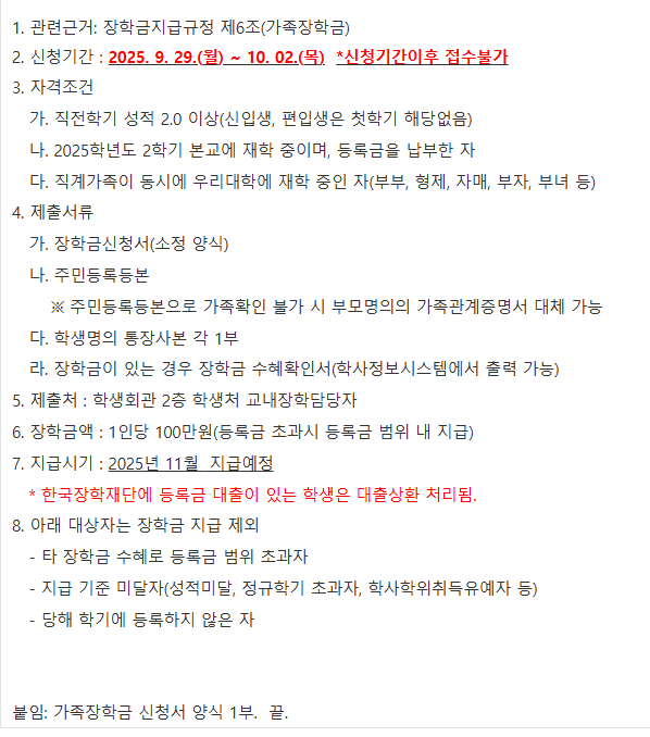 2학기 가족장학금 신청 안내