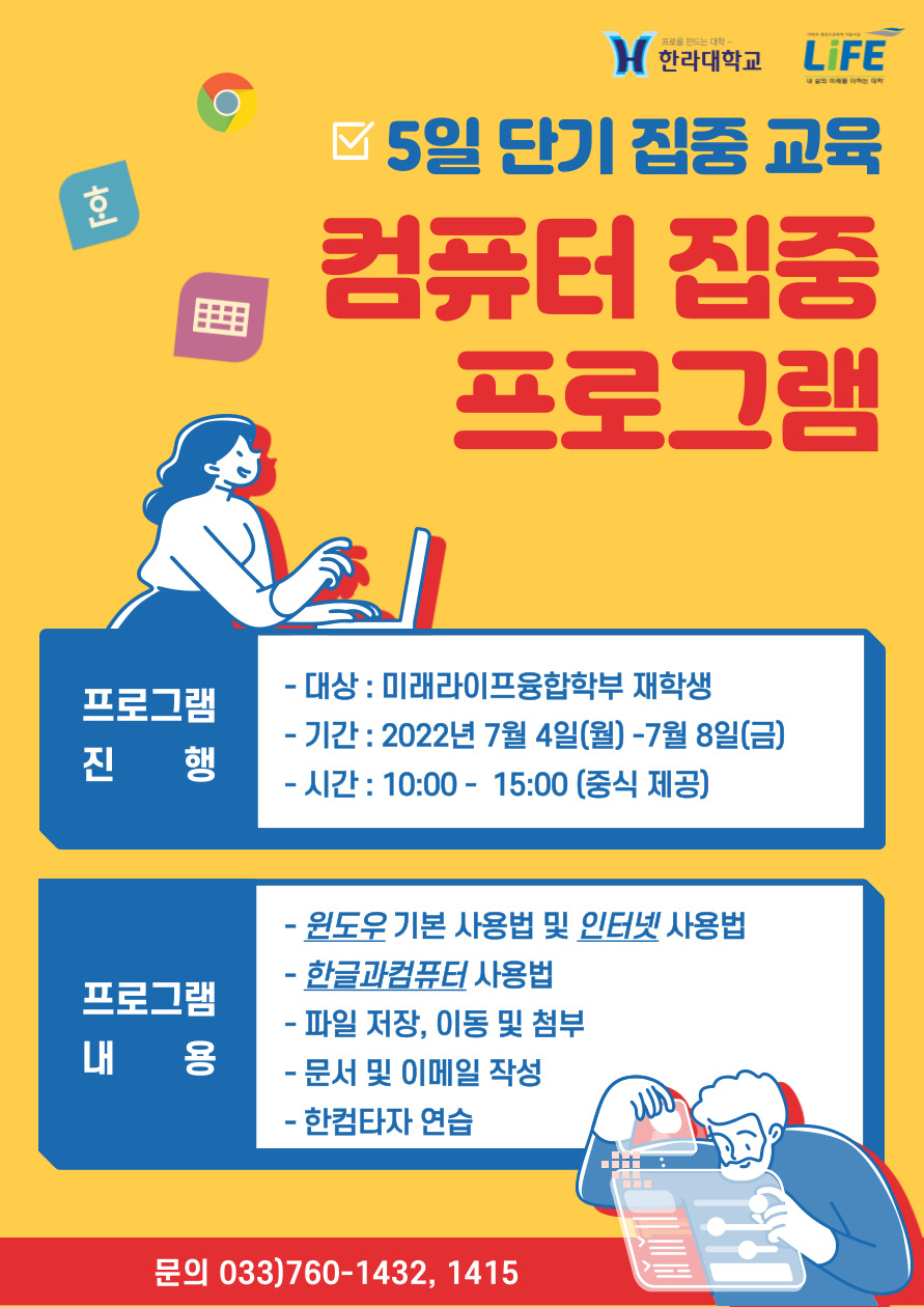 1. 프로그램명 : 컴퓨터 집중 프로그램 2. 대상 : 미래라이프융합학부 재학생 3. 기간 : 2022.07.04(화) ~ 07.08(금) / 10:00 ~ 15:00 (중식제공) 4. 프로그램 내용 : 윈도우 기본 사용법, 한글과컴퓨터 사용법, 문서 및 이메일 작성 등 5. 신청기간 : 2022.06.23(목) ~ 06.28(화) 성인학습자지원센터 신ㄴ청 6. 문의 : 033-760-1432, 1415 |